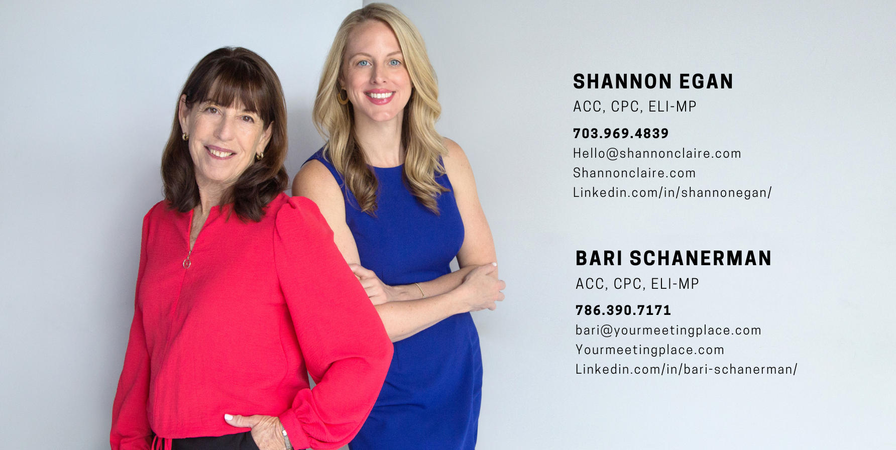 Bari Schanerman and Shannon Egan are two coaches on a mission to help companies create and sustain thriving workplaces. With a combined 50+ years of experience in corporate careers and entrepreneurship, they are both certified professional coaches by iPEC (Institute of Professional Excellence in Coaching) and both hold ICF (International Coaching Federation) credentials as well.